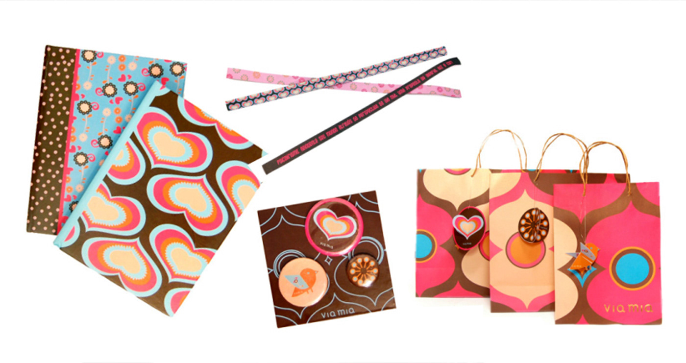 Criei a estampa Psicolirismo para o verão 2009 que tinha inspiração nos anos 70. Fiz uma segunda estampa com elementos retrô que foram também usados em diversos produtos.